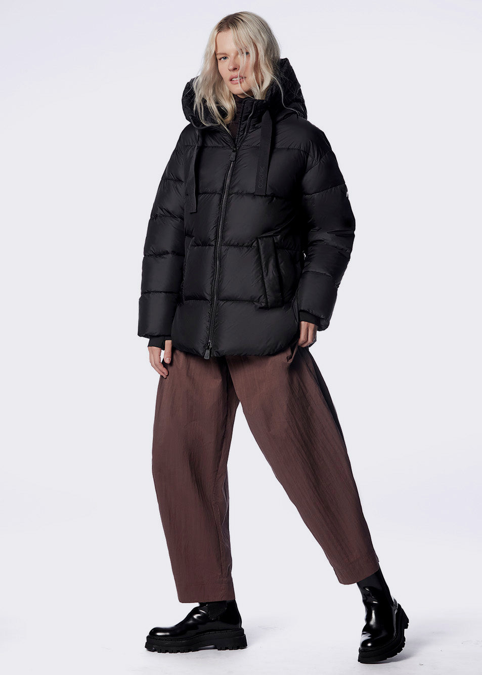 • Capuche large fixe avec un cordon plat et un logo 3D ton sur ton, peut être ajustée décontractée comme souhaité