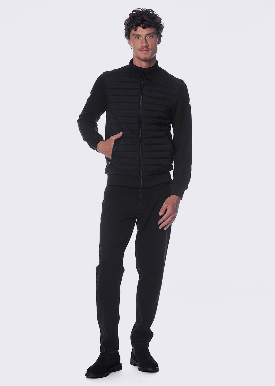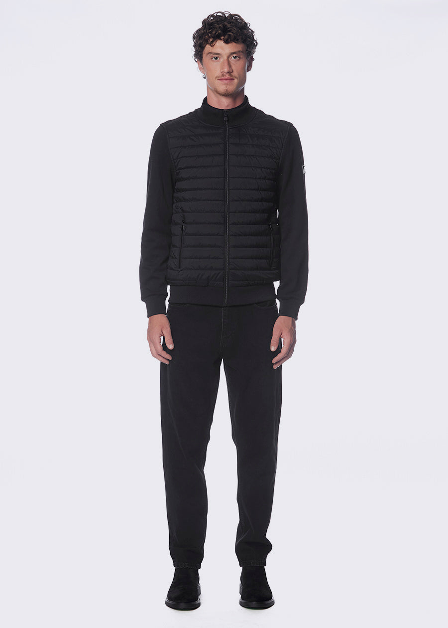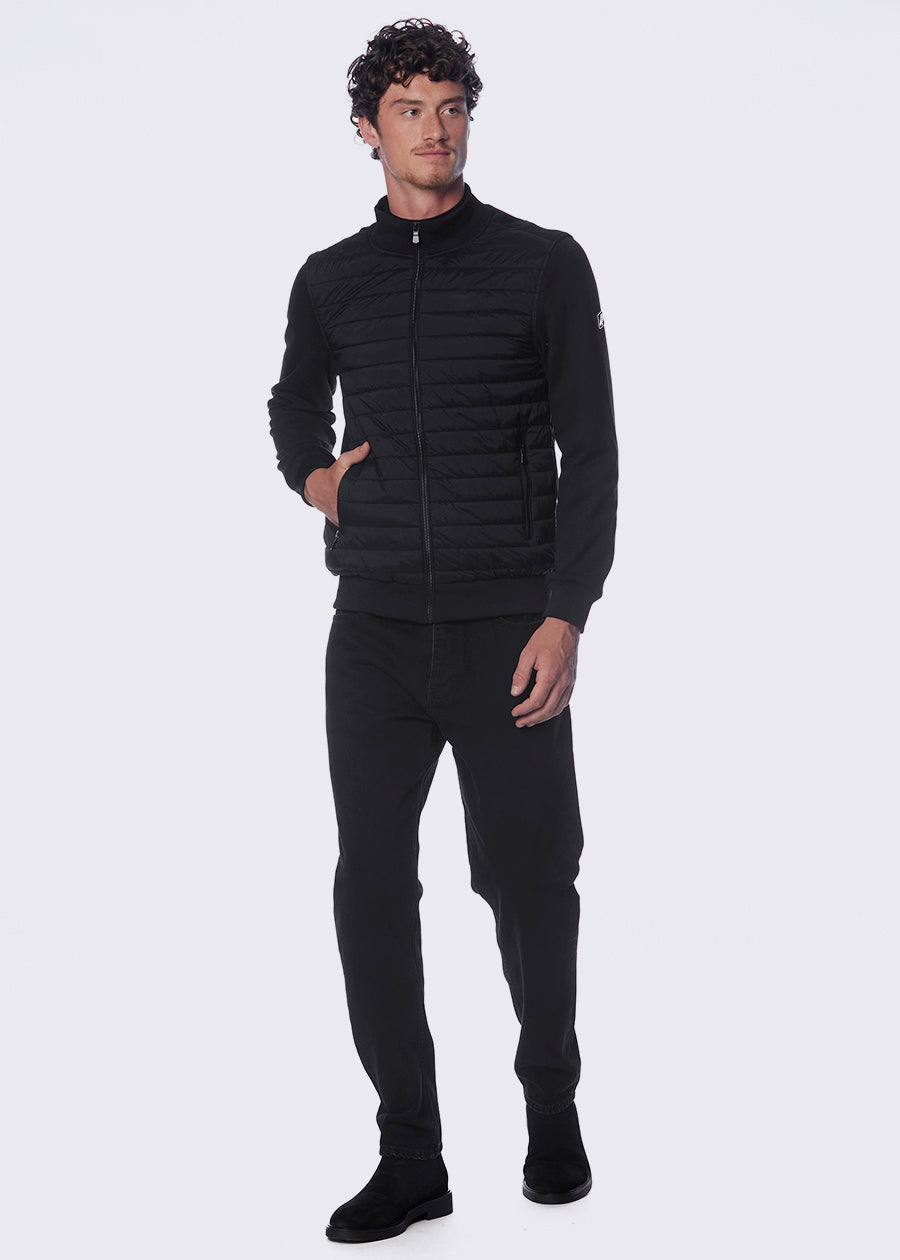 The JAMIESON is a men's transitional jacket featuring a classic bomber style with a semi-tailored fit. It's padded with recycled polyester and features a very soft knitted fabric on sleeves and back. This style is a modern and casual piece for any season.